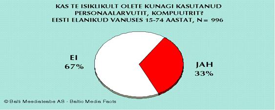 Lähtuvalt Balti meediateabe AS poolt läbiviidud esinduslikust uuringust Eesti 15-74aastaste elanike hulgas on kolmandik (33%) Eesti elanikke kasutanud kunagi oma elus arvutit.