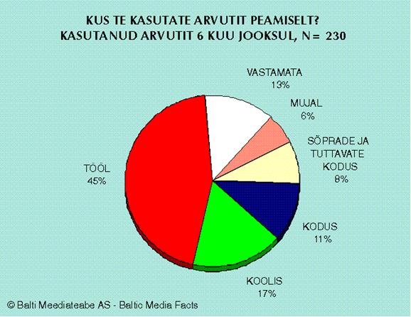 •Peamiseks põhjuseks, miks arvutit kasutatakse on tekstitöötlusprogrammide kasutamine, millele järgnevad arvutimängude mängimine. 69 tuhat ehk 6% Eesti 15-74aastast elanikku on kasutanud viimase kuue kuu jooksul internetti. Ainult 1% elanikest on kodus interneti ühendusega arvuti. Märkimist väärib, et Eesti interneti kasutajate hulgas sarnaneb naiste osakaal (38%) USA ja Suurbritannia vastavale näitajale. Samas on internet siiski paljuski nooremate inimeste pärusmaa - 89% Eesti interneti kasutajatest on vanuses 15-39 aastat. Peamiseks interneti kasutamise põhjuseks oli informatsiooni otsimine.