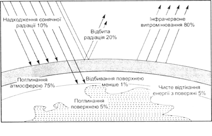 Парниковий ефект атмосфери — це захисна дія атмосфери в процесі променистого теплообміну Землі з космічним простором. Ефект ґрунтується на здатності атмосфери пропускати короткохвильові видимі промені Сонця до земної поверхні і нагрівати її. У результаті нагрівання Земля випромінює довгохвильові інфрачервоні невидимі для людського ока промені, більша частина яких затримується атмосферою і нагріває її. Нагріта таким чином атмосфера надсилає до Землі зустрічне випромінювання, компенсуючи значною мірою втрату тепла земною поверхнею (рис. 1). Таким чином, парниковий ефект існував у природі незалежно від діяльності людини і без нього життя на Землі було б неможливе.
