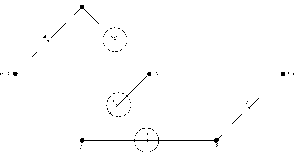 Как видно из рисунка, ребра {6,9},{7,9},{3,9}, питающие вершину w , насыщенны, а оставшееся ребро {8,9}, питающееся от вершины 8, не может получить большее значение весовой функции, так как насыщенны все ребра, питающие вершину 8. Другими словами - если отбросить все насыщенные ребра, то вершина w недостижима, что является признаком максимального потока в сети.